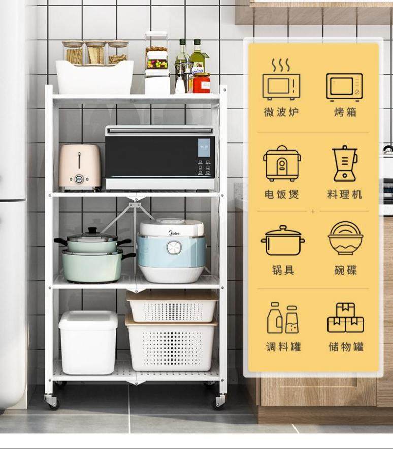 随着烹饪方式的丰富,厨房的电器设备逐渐增多,如微波炉、烤箱、料理机等,想把这些电器通通收纳起来,四层可折叠置物架可助你一臂之力!四层大容量设计,非常适合收纳,也节省了厨房空间。